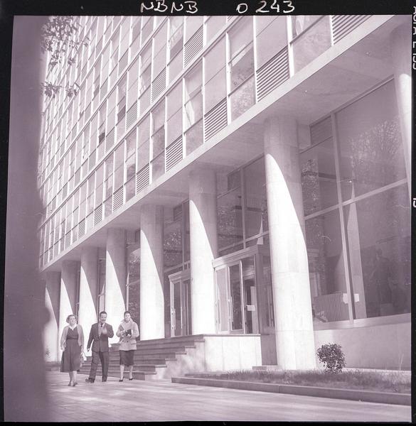 [Dos señoras acompañadas de un caballero, en el frontis de un gran edificio] [fotografía] Ignacio Hochhäusler.