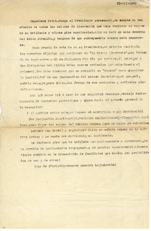[Carta] 1962 diciembre 23, Santiago, Chile [a] Jorge Alessandri Rodríguez [manuscrito] Magdalena Petit.