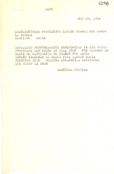 [Telegrama] 1956 nov. 26 [al] Presidente Carlos Ibáñez del Campo, Santiago, [Chile] [manuscrito] Gabriela Mistral.