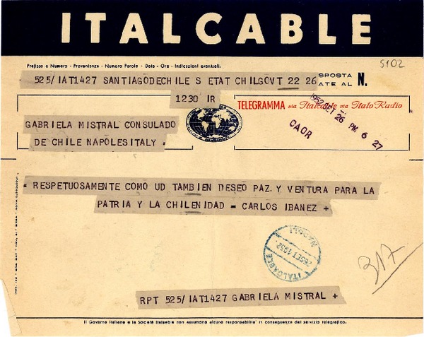 [Telegrama] 1952 sept. 26, Santiago, Chile [a] Gabriela Mistral, Nápoles, Italia [manuscrito] Carlos Ibáñez.
