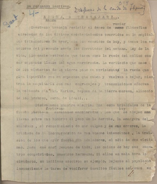 ¡Ahora a trabajar!... [manuscrito] Fernando Santiván.