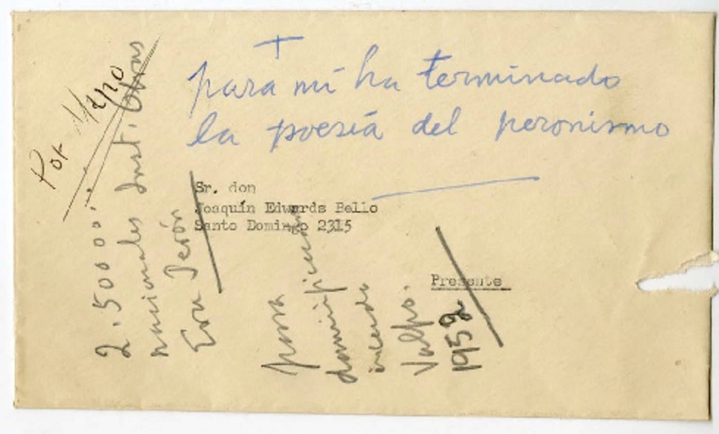 [Tarjeta] 1956 nov. 6, Santiago, Chile [a] Joaquín Edwards Bello
