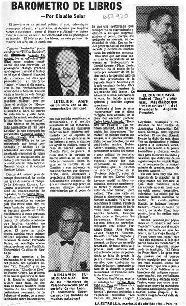 Alvarado León, Carlos - Orrego Vicuña, Claudio - Varas, Florencia - Pinochet Ugarte, Augusto - Superventas - Autores chilenos - Ruiz S., Carlos - Dahse, Fernando - Caso Letelier - Mapa de la extrema riqueza - Día decisivo - Puerto en la botella