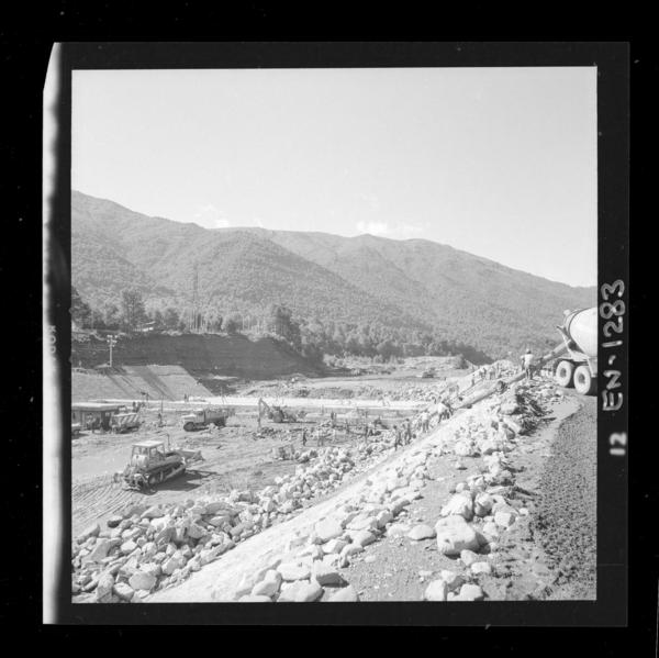 Faenas de excavación y revestimiento s del canal de desviación del río Polcura, vista hacia aguas abajo. [fotografía] Luis Ladrón de Guevara.
