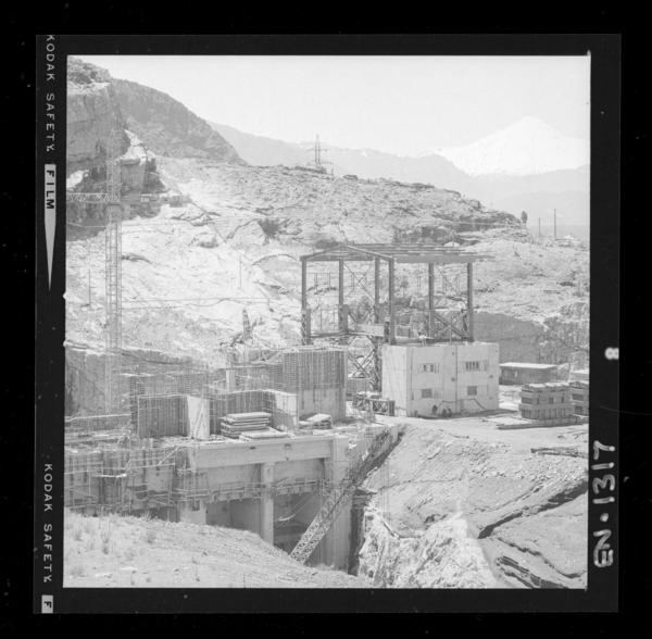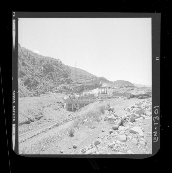 Construcción de la casa de máquinas, se aprecia la salida de dos túneles que alimentarán las turbinas. [fotografía] Luis Ladrón de Guevara.
