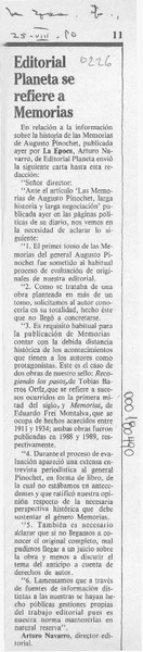 Editorial Planeta se refiere a memorias [artículo] Arturo Navarro.