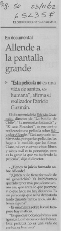 Allende a la pantalla grande [artículo] El Mercurio (Valparaíso) nov. 23, 2002, p. 50 .
