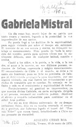 Gabriela Mistral [artículo] / Augusto César Roa. La Voz de Colchagua (San Fernando, Chile)-- ene. 12, 1970, p. 2. .