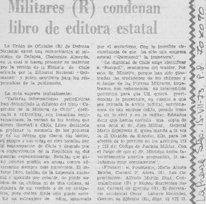 Militares (R) condenan libro de editora estatal. [artículo] La Prensa (Santiago, Chile)-- jul. 15, 1973, p. 8. .