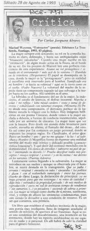 Marisol Wexman, "Entreactos" [artículo] / Carlos Jorquera Alvarez. Las Últimas Noticias (Diario : Santiago, Chile)-- ago. 28, 1993, p. 35 retr. .