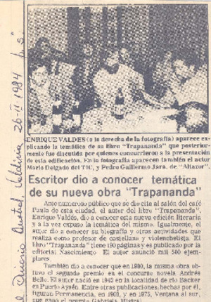 Escritor dió a conocer temática se du nueva obra "Trapananda" [artículo]. El Diario Austral (diario : Valdivia, Chile)-- feb. 26, 1984, p. 5. .