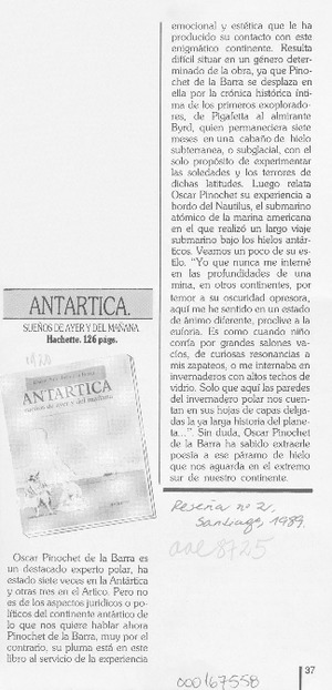 Antártica, sueños de ayer y del mañana [artículo]. Reseña. -- no. 2, 1989, p. 37 il. .
