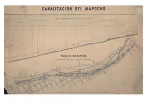 Canalización del Mapocho perfil lonjitudinal pasando por el centro del cauce / [material cartográfico] : proyecto presentado por el Director en jefe de los trabajos municipales de Santiago, ingeniero Don Ernesto Ansart por encargo de la Municipalidad de Santiago y Don Luis Cousiño. [Santiago : s.n.], 1873 1 plano; 70 x 50 cm. .