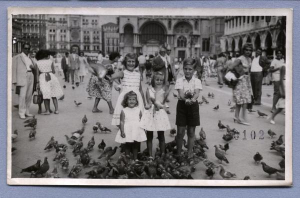 [Hermanos Alessandri : Patricia, Arturo, Magdalena y Francisca, rodeados de palomas] [fotografía].