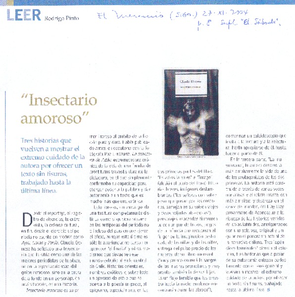 Autoras chilenas - DONOSO, CLAUDIA - Entrevistas - Insectario amoroso