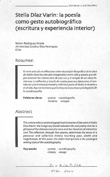 Stella Díaz Varin: la poesía como gesto autobiográfico [artículo] Nelson Rodríguez Arratia