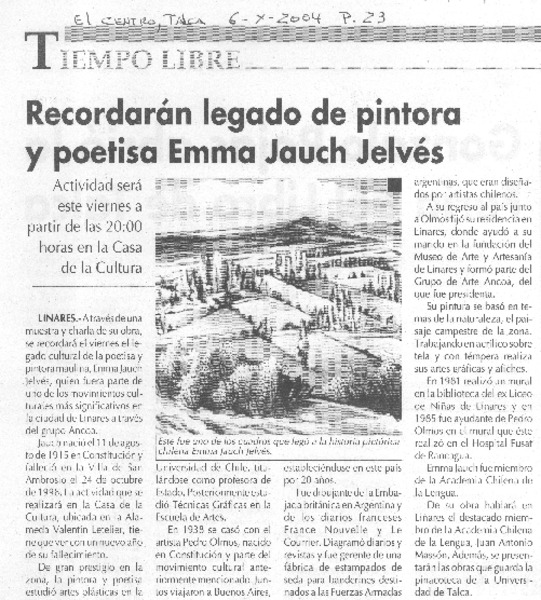 REcordarán legado de pintora y poetisa Emma Jauch Jélves [artículo]