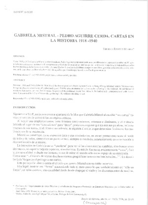 Gabriela Mistral-Pedro Aguirre Cerda, cartas en la historia 1918-1940 [artículo] / Virginia Rioseco Medina. Revista de Historia (Revista : Concepción, Chile)-- no. 16 (2006) p. 23-36. .