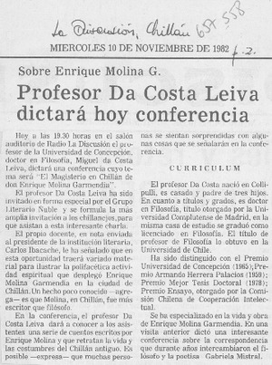 Profesor Da Costa Leiva dictará hoy conferencia. [artículo] La Discusión (Chillán, Chile)-- nov. 10, 1982, p. 2. .