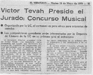 Víctor Tevah Preside el Jurado: Concurso Musical [artículo] El Mercurio (diario : Santiago, Chile) may. 16, 1978, p. 31. .