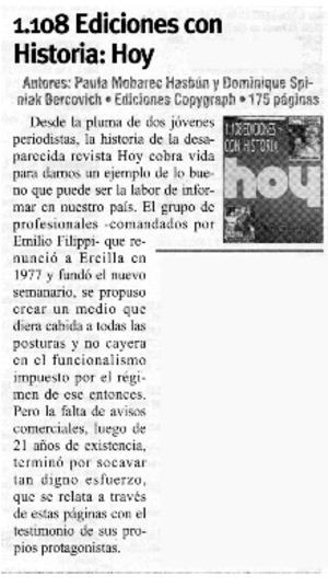 1.108 Ediciones con historia : Hoy [artículo] La Hora (Diario : Santiago, Chile)-- oct. 29, 2001, p. 17. il. .