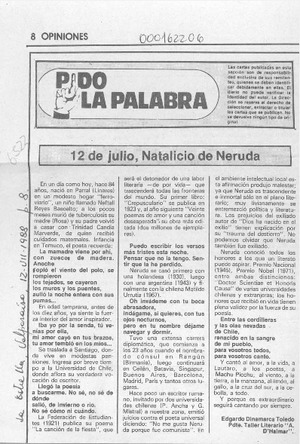 12 de julio, natalicio de Neruda [artículo] / Edgardo Dinamarca Toledo. La Estrella. -- jul. 12, 1988, p. 8. .