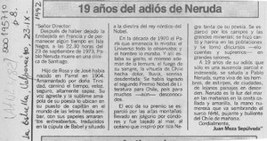 19 años del adiós de Neruda [artículo] / Juan Meza Sepúlveda. La Estrella. -- sept. 23, 1992, p. 8. .