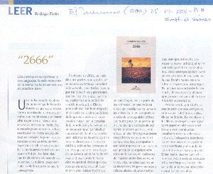 2666 [artículo] / Rodrigo Pinto. El Mercurio (Diario : Santiago, Chile) dic. 25, 2004, p. 8 (suplemento "El Sábado") il. .