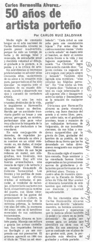 50 años de artista porteño [artículo] / Carlos Ruíz Zaldívar. La Estrella (Valparaíso, Chile)-- jun. 14, 1980, p. 30. .