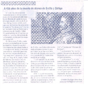 A 416 años de la muerte de Alonso de Ercilla y Zúñiga [artículo] / Cristián Rodrigo Vera Vera. El Diario Austral (Diario : Valdivia, Chile)-- nov. 30, 2010, p. 10. .