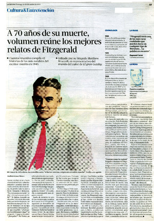 A 70 años de su muerte, volumen reùne los mejores relatos de Fitzgerald [artículo] / Andrès Gòmez Bravo. La Tercera (Diario : Santiago, Chile)-- dic. 26, 2010, p. 57 .