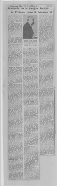 Academia de la Lengua recibió al profesor José R. Morales M. [artículo] El Mercurio (Diario : Santiago, Chile)-- oct. 30, 1974, p. 21. retr. .