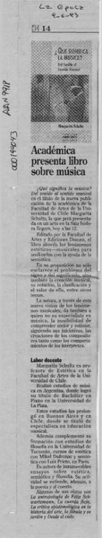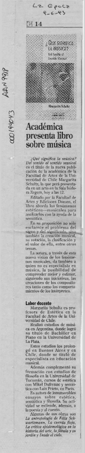 Académica presenta libro sobre música [artículo]. La Epoca. -- jun. 9, 1993, p. B14 .