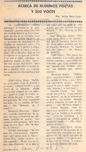 Acerca de algunos poetas y sus voces [artículo] / Julián Soto Luna. Concordia (Arica, Chile)-- abr. 17, 1976, p. 3. .
