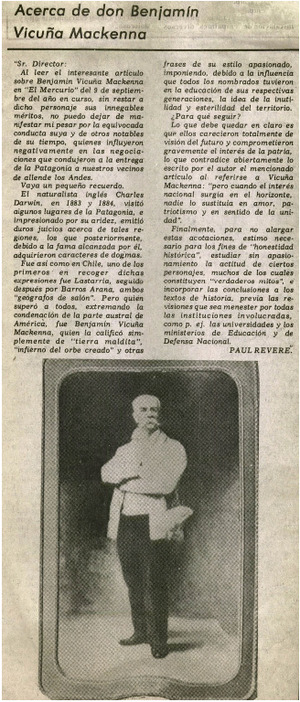 Acerca de don Benjamín Vicuña Mackenna [artículo] / Paul Revere. El Mercurio (Diario : Valparaíso, Chile)-- sept. 13, 1981, p. 4. retr. .