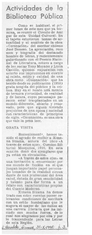 Actividades de la Biblioteca Pública [artículo]. El Heraldo. -- oct. 31, 1990, p. 3. .
