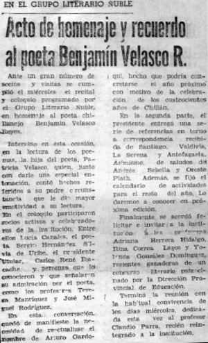 Acto de homenaje y recuerdo al poeta Benjamín Velasco R. [artículo] La Discusión (Chillán, Chile)-- oct. 19, 1979, p. 2. .
