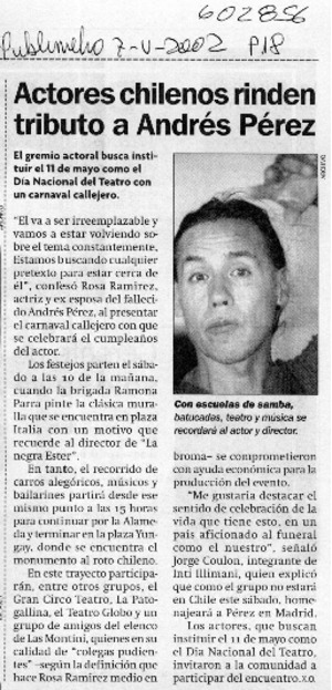 Actores chilenos rinden tributo a Andrés Pérez [artículo] Publimetro (Santiago) mayo 7, 2002, p. 18 retr. .