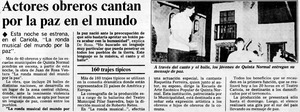 Actores obreros cantan por la paz en el mundo. [artículo] La Segunda (Diario : Santiago, Chile)-- abr. 18, 1985, p. 42. retr. .
