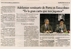 Adelantan seminario de Parra en Estocolmo: "Es la gran carta que nos jugamos" [artículo] / Juan Carlos Ramírez F. La Segunda (Diario : Santiago, Chile)-- mayo 30, 2012, p. 35. .