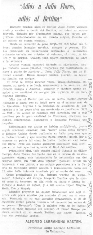 Adiós a Julio Flores, adiós al Bettina [artículo] / Alfonso Larrahona Kästen. La Discusión (Chillán, Chile)-- dic. 31, 1979, p. 3. .