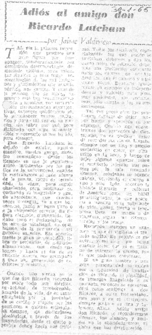 Adiós al amigo don Ricardo Latcham [artículo] / Jaime Valdivieso. Ultima Hora (Diario : Santiago, Chile)-- ene. 30, 1965 .