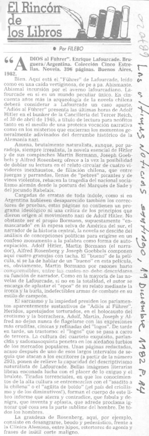 Adiós al Führer" [artículo] / Filebo. Las Últimas Noticias (Diario : Santiago, Chile)-- dic. 19, 1982, p. 4. .