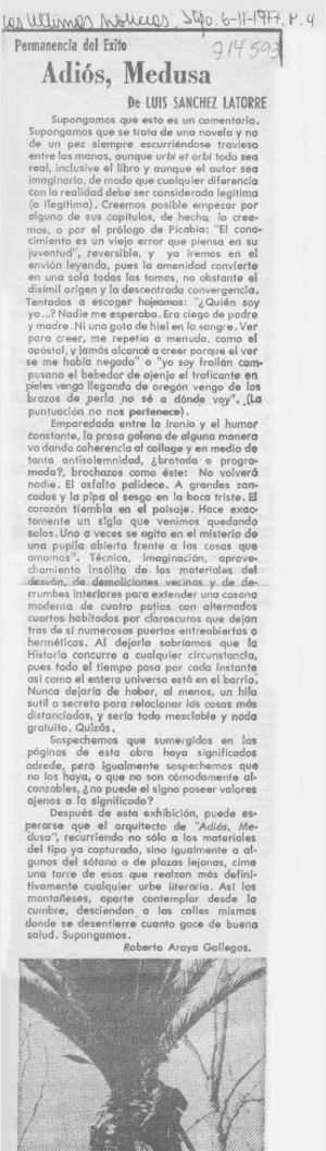 Adiós, medusa [artículo] / Roberto Araya Gallegos. Las Últimas Noticias (Diario : Santiago, Chile)-- feb. 6, 1977, p. 4. .