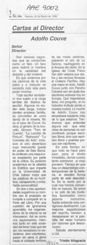 Adolfo Couve [artículo] / Tristán Altagracia. El Día (diario : La Serena, Chile)-- mar. 20, 1998, p. 2. .