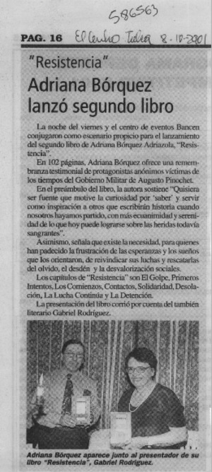 Adriana Bórquez lanzó segundo libro [artículo] El Centro abr. 8, 2001, p. 16 retr. .
