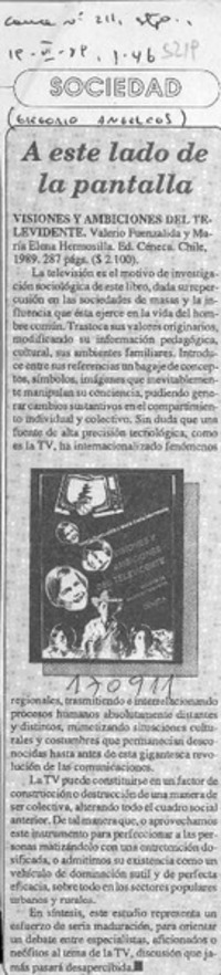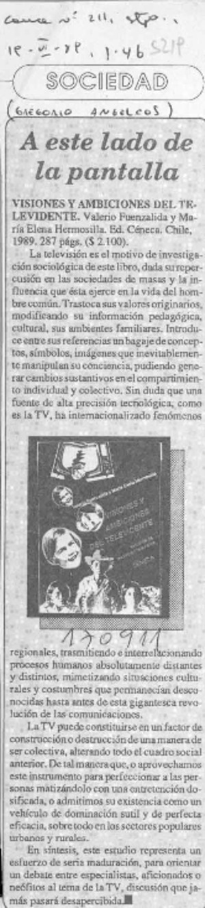 A este lado de la pantalla [artículo] / Gregorio Angelcos. Cauce (Santiago). -- no. 211 (jun. 19, 1989) p. 46 retr. .