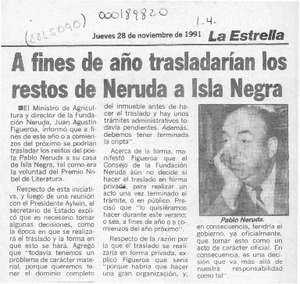 A fines de año trasladarían los restos de Neruda a Isla Negra [artículo]. La Estrella. -- nov. 28, 1991, p. 4. retr. .