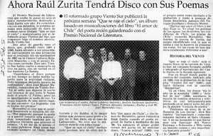 Ahora Raúl Zurita tendrá disco con sus poemas [artículo] El Mercurio (Santiago) sept. 7, 2000, p. C15 retr. .
