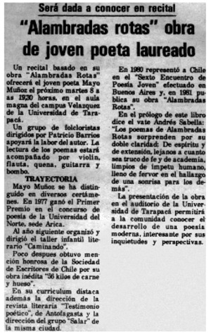 Alambradas rotas" obra de joven poeta laureado. [artículo] La Estrella de Arica (Arica, Chile)-- jul. 3, 1982, p. 6. .